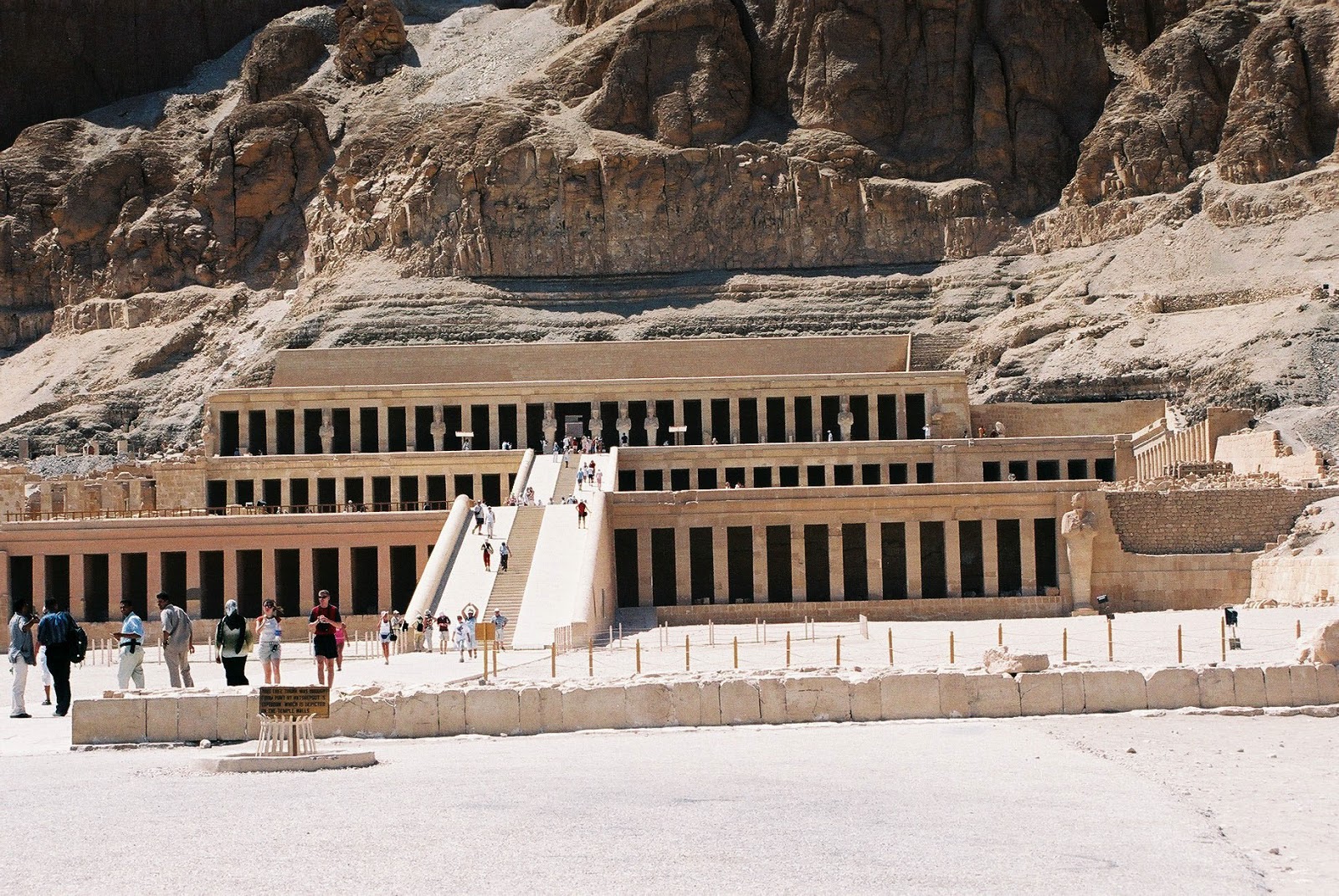 Po zakupowej przerwie przejechaliśmy do kolejnej doliny, aby zwiedzić Świątynię Hatszepsut zwaną"Świątynią Milionów Lat". Po otwarciu drzwi autobusu uderzył w nas nieziemski wręcz żar rozgrzanych skał... Temperatura znacznie przekraczała 50 stopni i w tym gorącu trzeba było przejść po otwartej przestrzeni by móc w końcu schować się w cieniu świątyni... Nie polecam latem odwiedzin tego miejsca osobom o słabej tolerancji na upał lub osłabionym sercu...