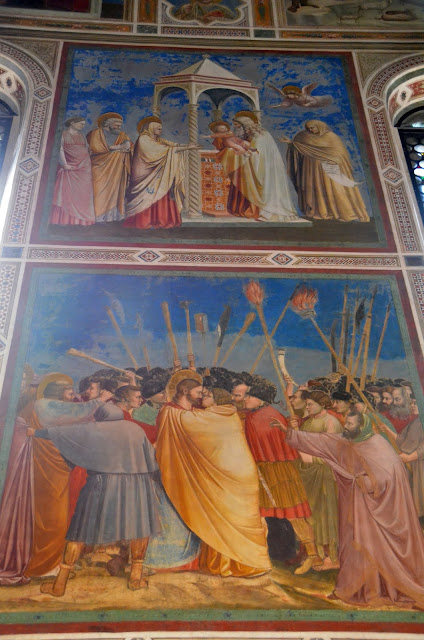 Historia jest kontynuowana w górnym pasie na ścianie południowej (z oknami) jako historia Joachima i Anny oraz historią Marii w najwyższym pasie obrazów na ścianie północnej i powraca na łuk triumfalny gdzie przedstawiono sceny Zwiastowania i nawiedzenia... W drugim od góry pasie obrazów na obu ścianach przedstawiono historię Jezusa. Następnie powracamy na łuk triumfalny, aby zobaczyć scenę przekazywania pieniędzy Judaszowi. Trzeci poziom na obu ścianach przedstawia sceny Pasji Chrystusa i jego Zmartwychwstanie. Wreszcie poziom czwarty, najniższy przedstawia Grzechy Główne na ścianie północnej i Cnoty na ścianie południowej. Zwieńczeniem całego cyklu jest przedstawiona na ścianie szczytowej scena Sądu Ostatecznego...