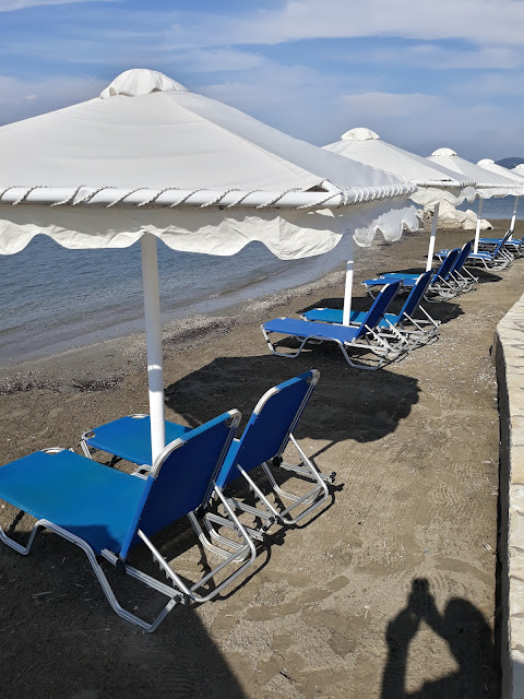 Plaża zasadniczo również dzieli się na dwie części. W prawo od głównego wejścia jest szersza i tu leżaki ustawione są w kilku rzędach. Natomiast plaża po lewej od wejścia jest wąska i tutaj mieści się jedynie jeden rząd, miejscami dwa rzędy parasoli z leżakami.