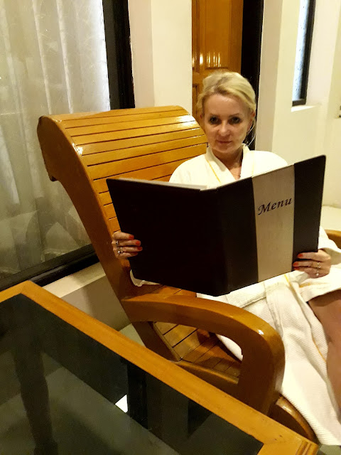 Fajna zabawa, ale trzeba byłoby coś przekąsić przed snem. I tu kolejny plus komfortu pobytu w tym hotelu. Posiłek można spożyć na balkonie. Oczywiście najpierw przegląd menu... Wraz z dostarczeniem menu zapytanie kelnera o napoje.